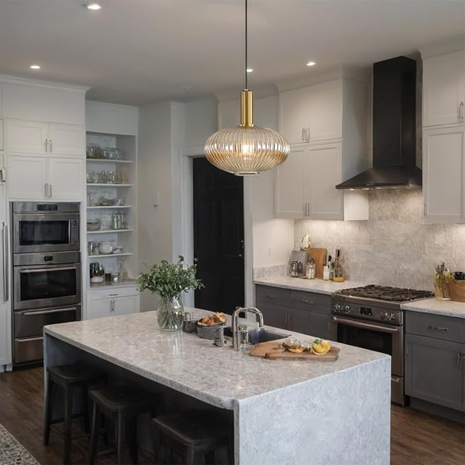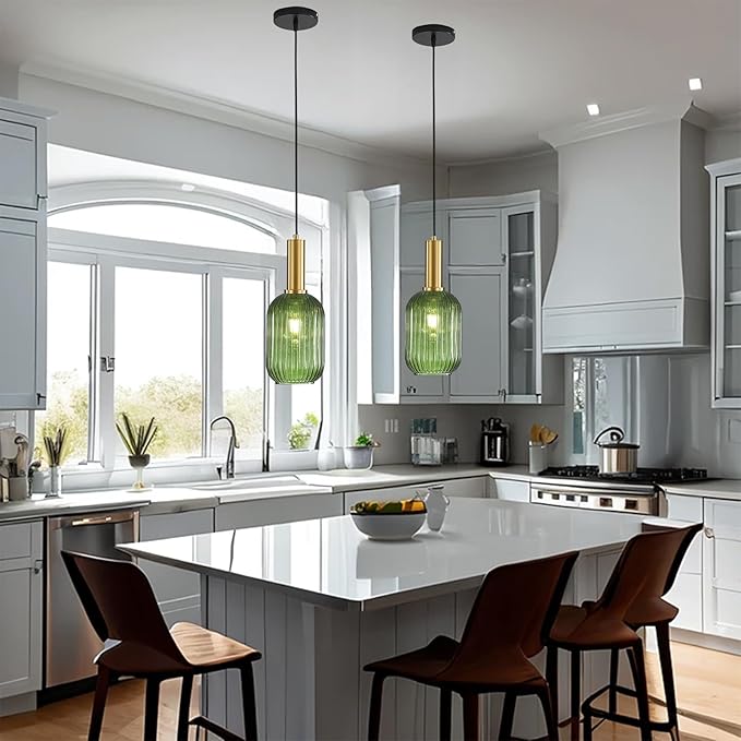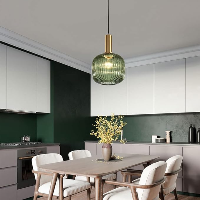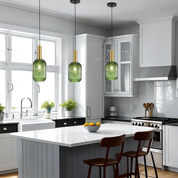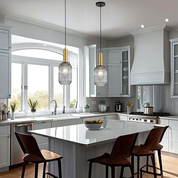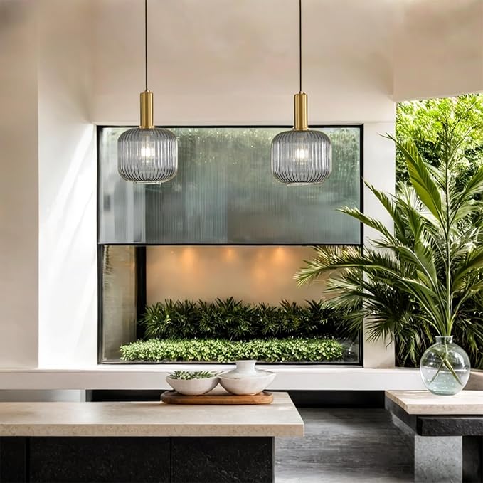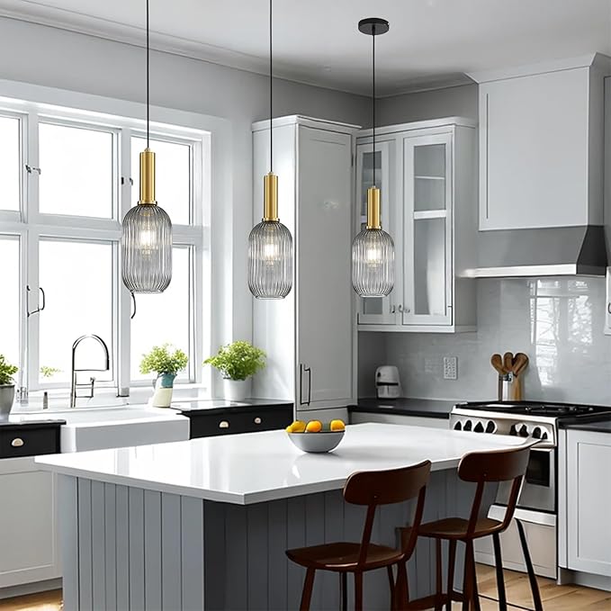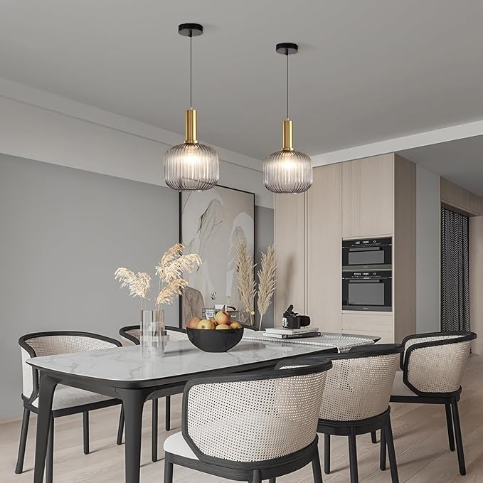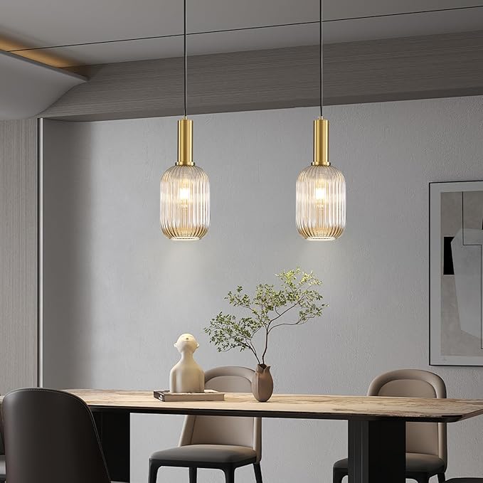 Ogni elemento presenta un diffusore in vetro scanalato con sottili righe verticali che catturano e rifrangono la luce con eleganza. Le montature in metallo con finitura ottone satinato donano un carattere sofisticato e retrò, impreziosendo l’insieme senza appesantirlo. Il cavo del lampadario è regolabile e la lunghezza può essere modificata in base alle proprie preferenze.