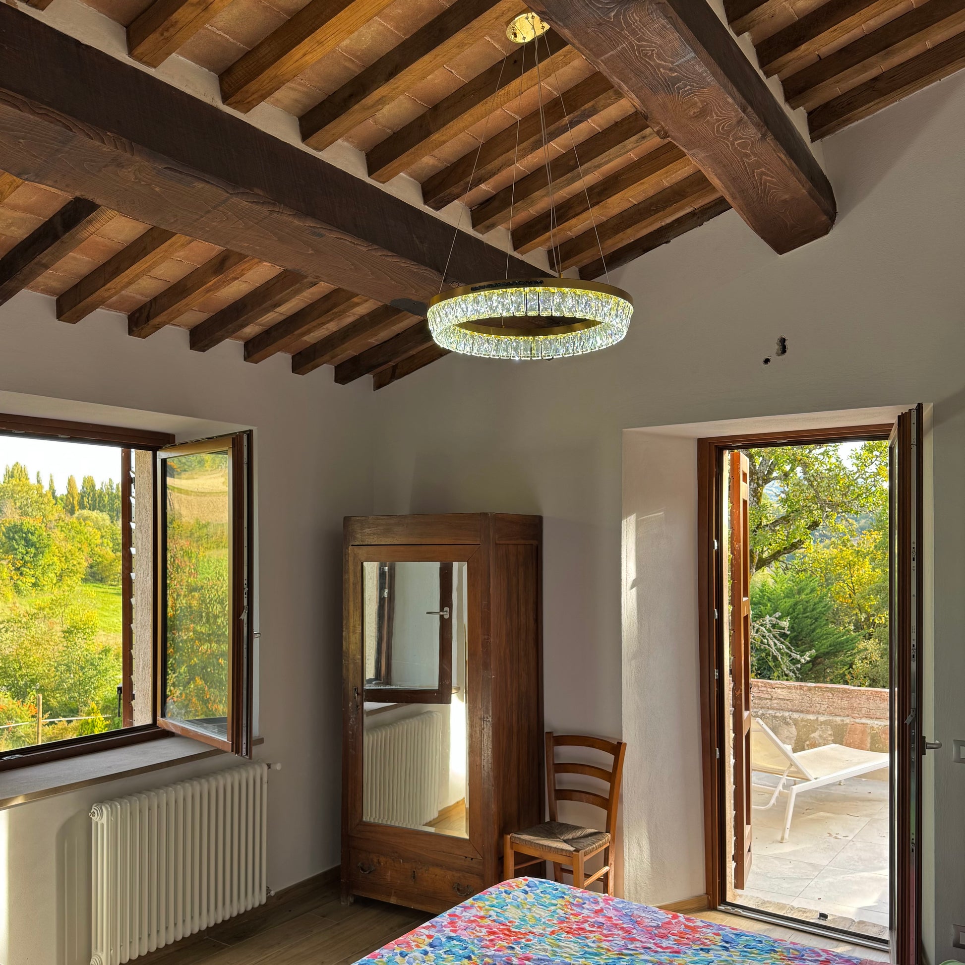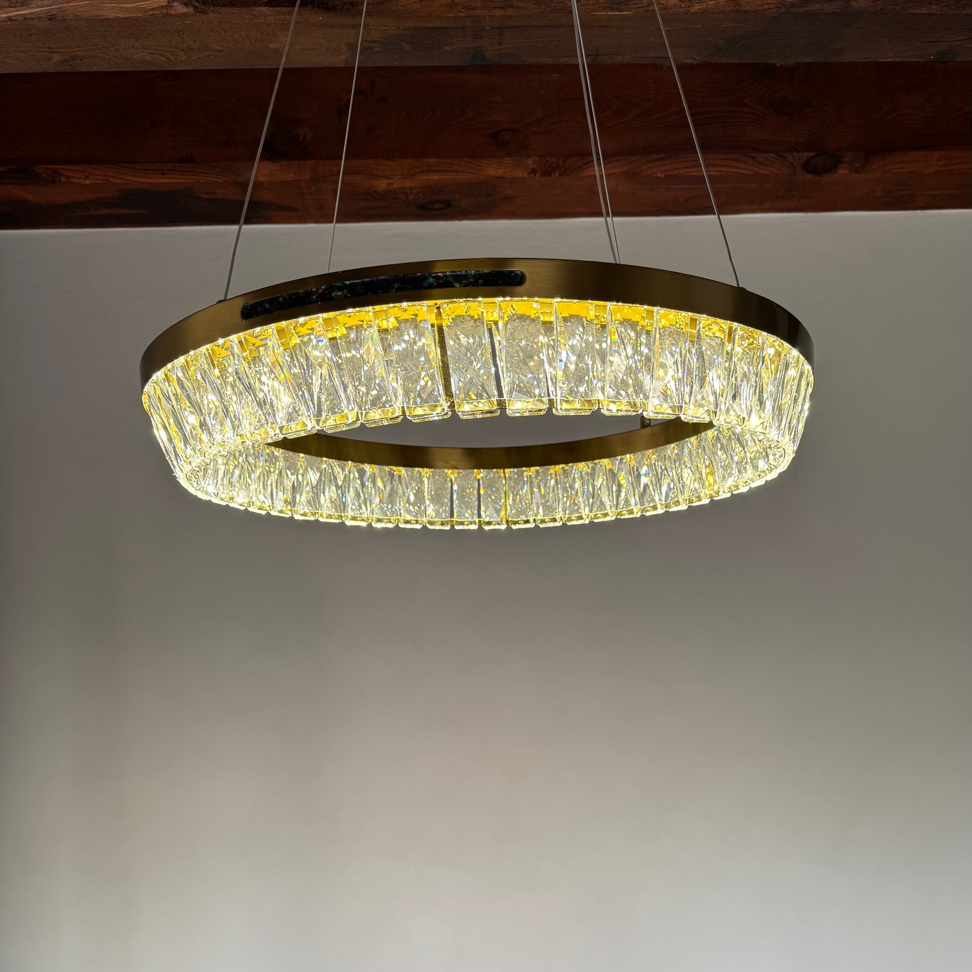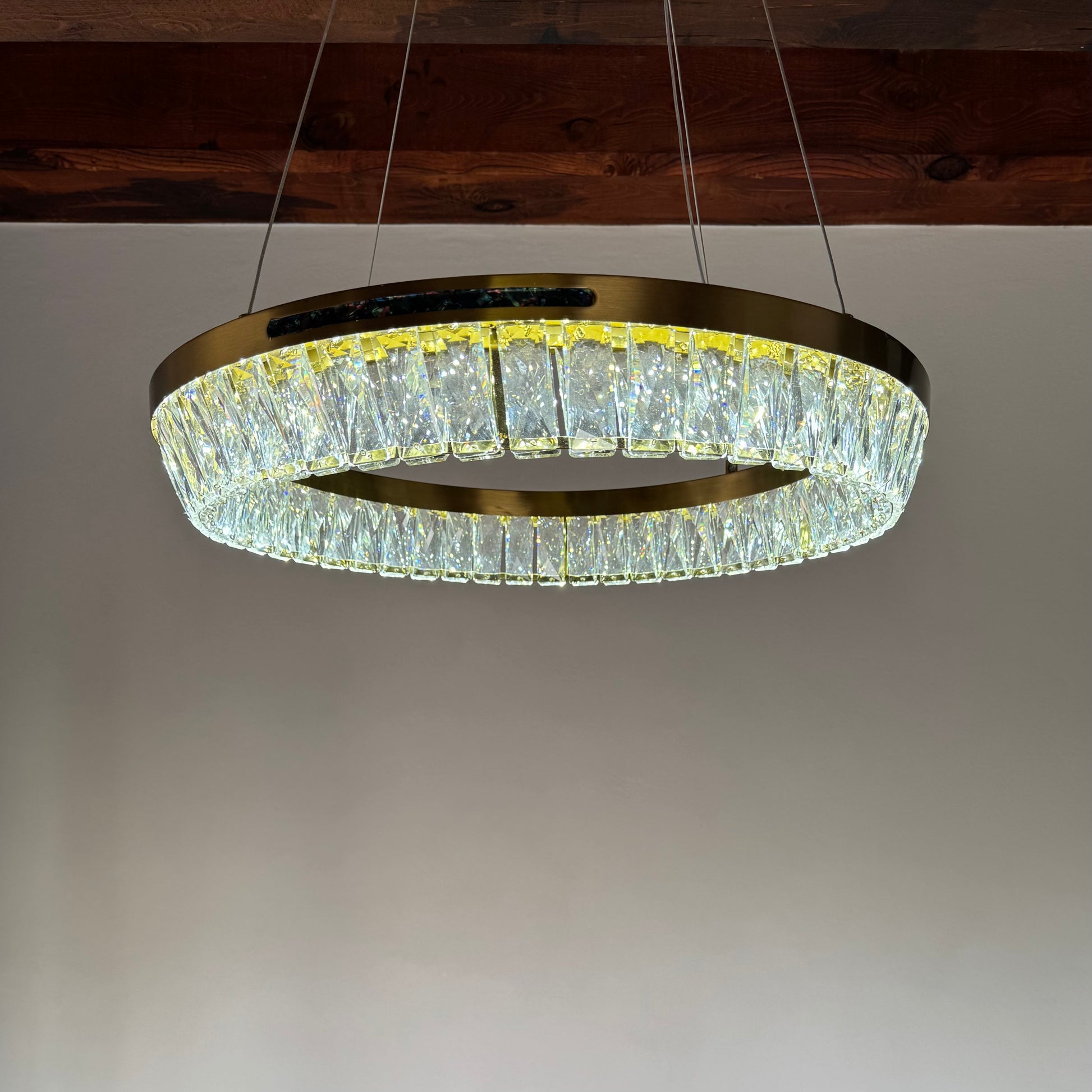E' realizzato in acciaio inossidabile, finemente rifinito per garantire solidità strutturale, resistenza alla corrosione e lucentezza duratura. La struttura è impreziosita da cristalli K9, noti per l'elevata trasparenza, purezza ottica e capacità di rifrazione della luce. La geometria ad anello e la sospensione mediante sottili cavi in tensione regolabili donano al corpo illuminante una presenza scenica sobria ma distintiva, perfetta per valorizzare ambienti moderni e di rappresentanza.