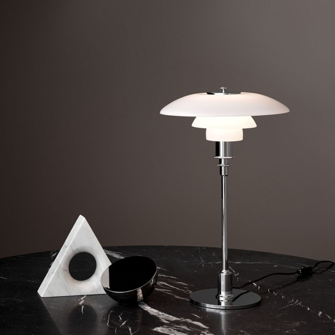 Si distingue per il suo design innovativo in grado di garantire un eccellente controllo dell'abbagliamento. Segue il principio di un sistema riflettente a tre paralumi, indirizzando la maggior parte della luce verso il basso. La struttura si ispira alla spirale logaritmica, una curva matematica presente in molteplici fenomeni naturali. Questa particolare forma consente una distribuzione uniforme della luce lungo tutta la superficie del paralume che, unita alla riflessione diffusa attraverso il vetro, genera un'illuminazione armoniosa e priva di abbagliamento. Le superfici cromate conferiscono un'ulteriore tocco di eleganza dell'oggetto, che si propone come un raffinato punto focale in grado di arricchire significativamente qualsiasi ambiente con un valore decorativo elevato.