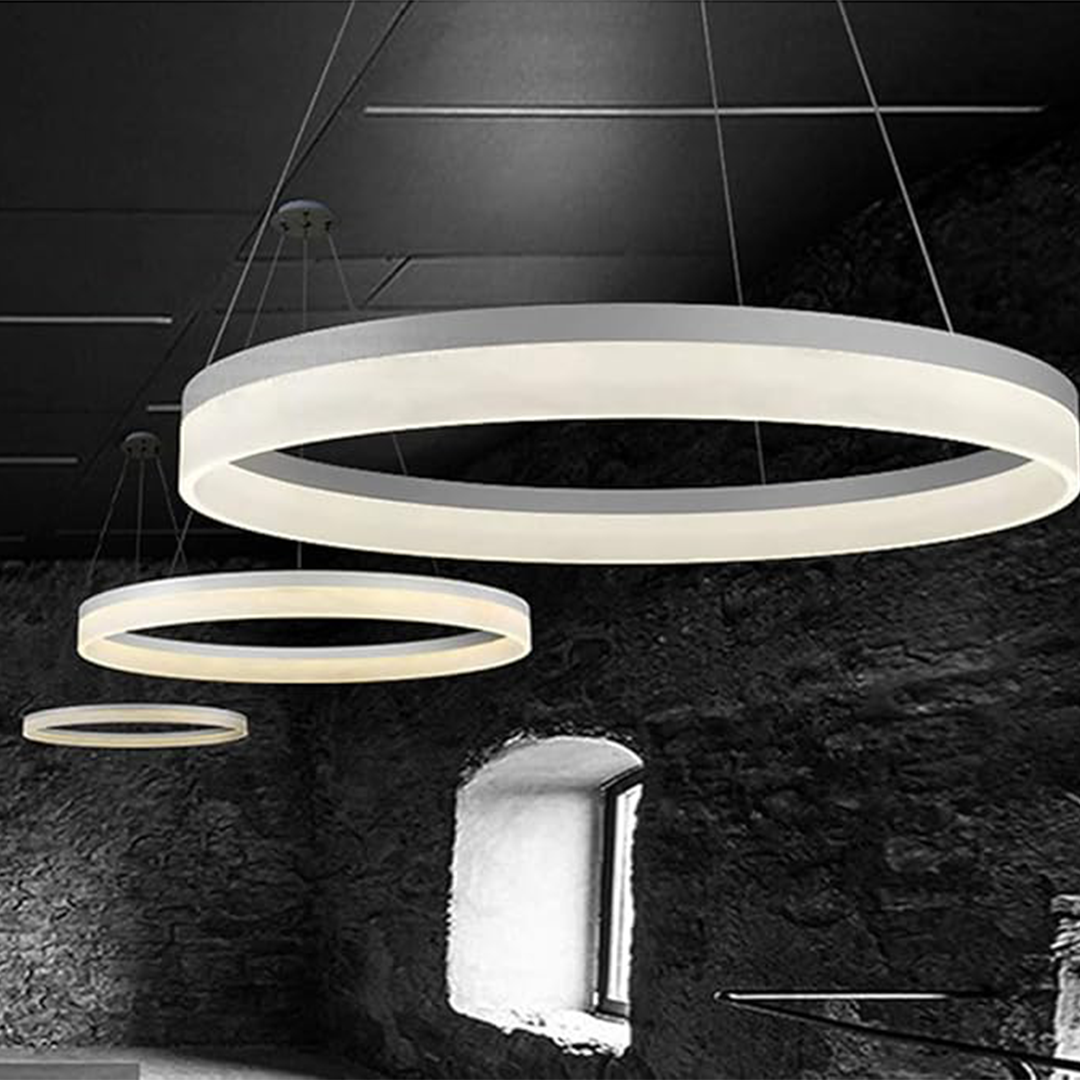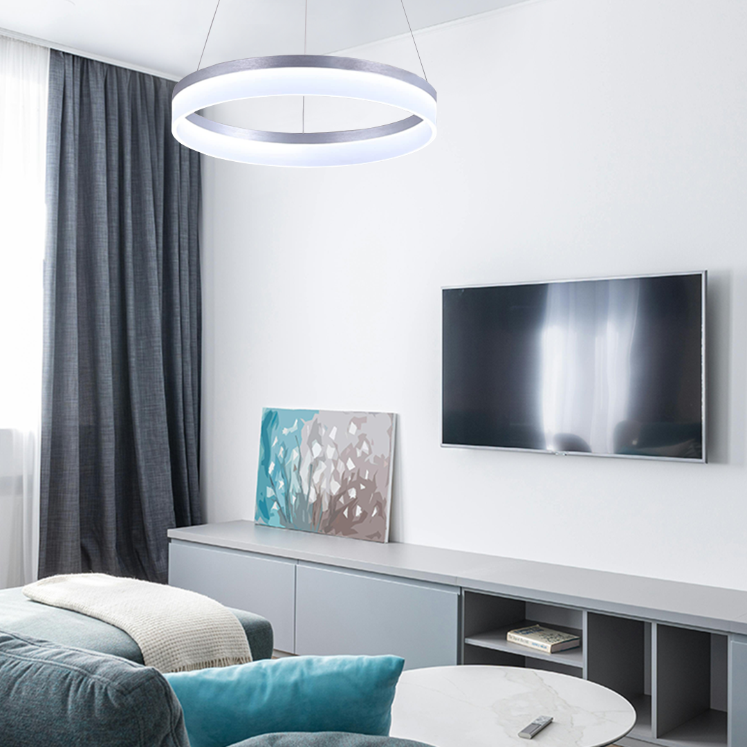 La lampada è ancorata al soffitto mediante una piastra in metallo, caratterizzata da un’elevata capacità di carico e stabilità. Il telaio è realizzato in alluminio e la striscia LED in acrilico opalino. La lunghezza della sospensione è regolabile fino a 100 cm.