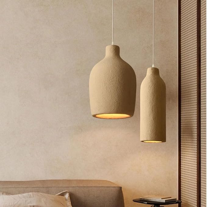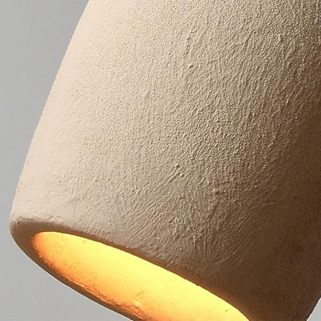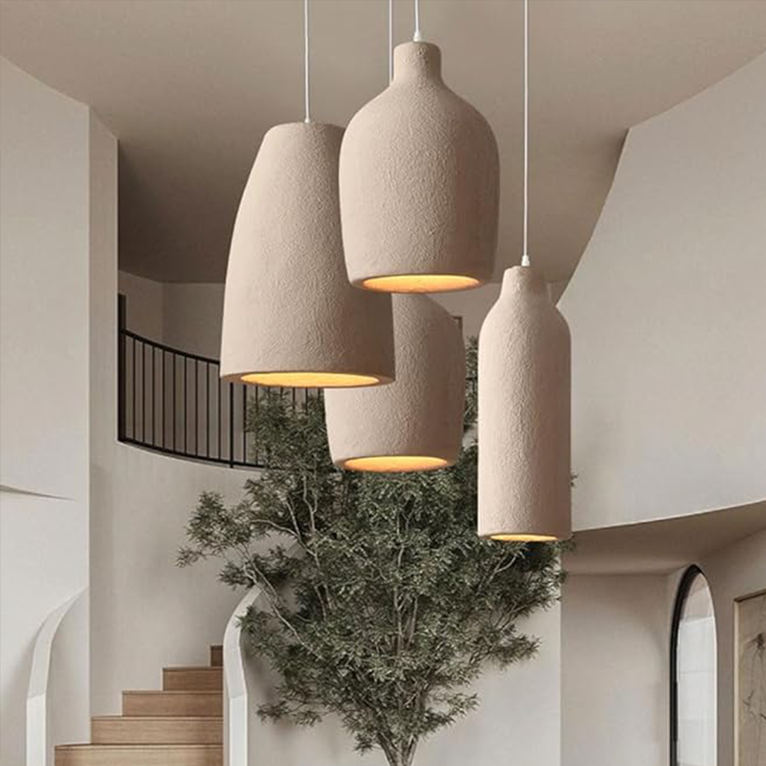Lampada a sospensione contemporanea, realizzata con paralumi in materiale a superficie ruvida che richiamano volumi ceramici artigianali. La sorgente luminosa orientata verso il basso garantisce un’illuminazione intensa ma confortevole, ideale per zone living e ambienti contract. L’armonia delle forme scultoree unita alla sobria eleganza del design ne fanno un elemento distintivo di arredo e luce.